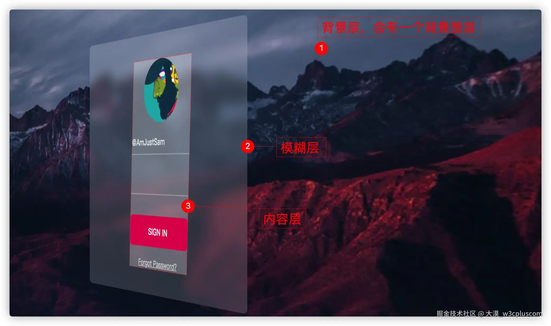 CSS的backdrop-filter属性出现之后,使用该属性替代filter制作磨砂玻璃效果会更逼真。基于上面的示例稍作调整,可以得到一个更逼真的磨砂玻璃效果: