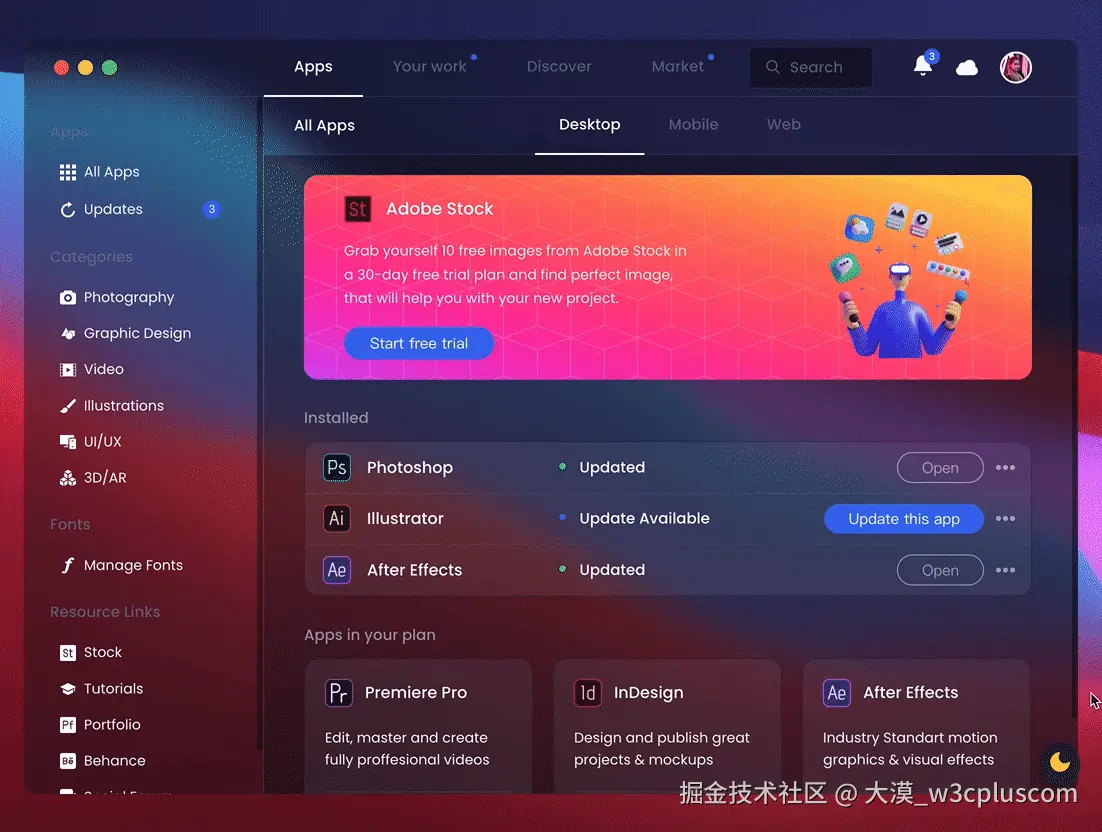 @Aysenur Turk在Codepen构建了一个Glassmorphism Creative Cloud App Redesign效果,如果你对Glassmorphism UI效果感兴趣的话,可以查看下面Demo中的代码: