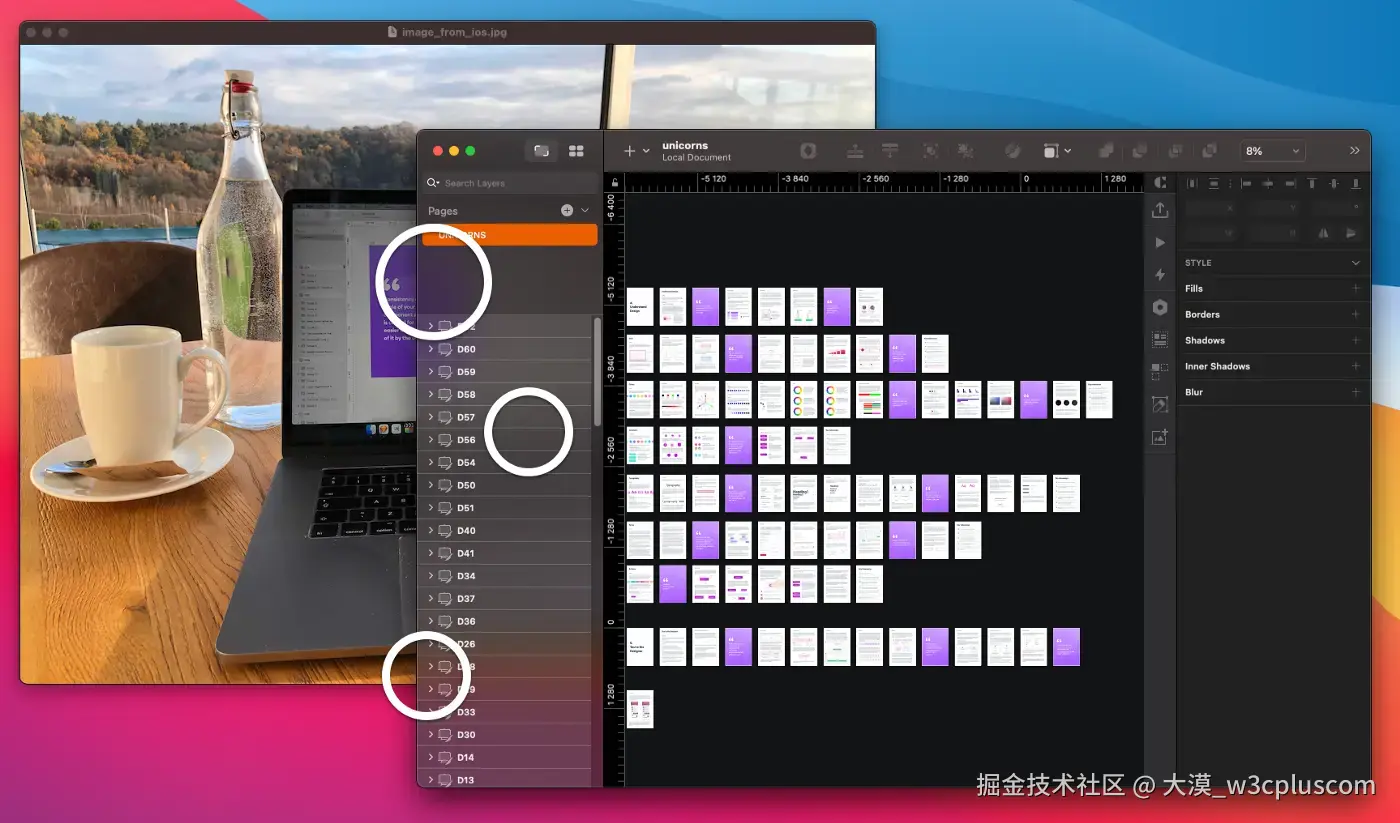 或许你已经发现了,Mac OS Big Sur把这种效果(透明到模糊的效果)再一次增强了。比如下图中Sketch设计软件的窗口背景模糊是最清晰可见的(下图中白圈圈中的部分):