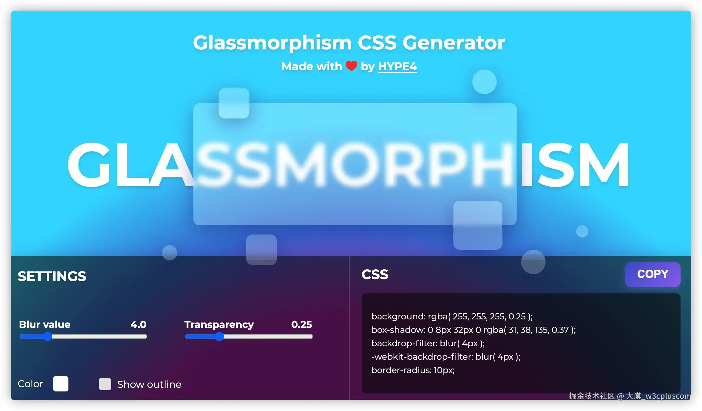 如果觉得自己手撸撸不出好的Glassmorphism UI效果,也可以使用 @hype4 提供的在线生成CSS代码的工具: