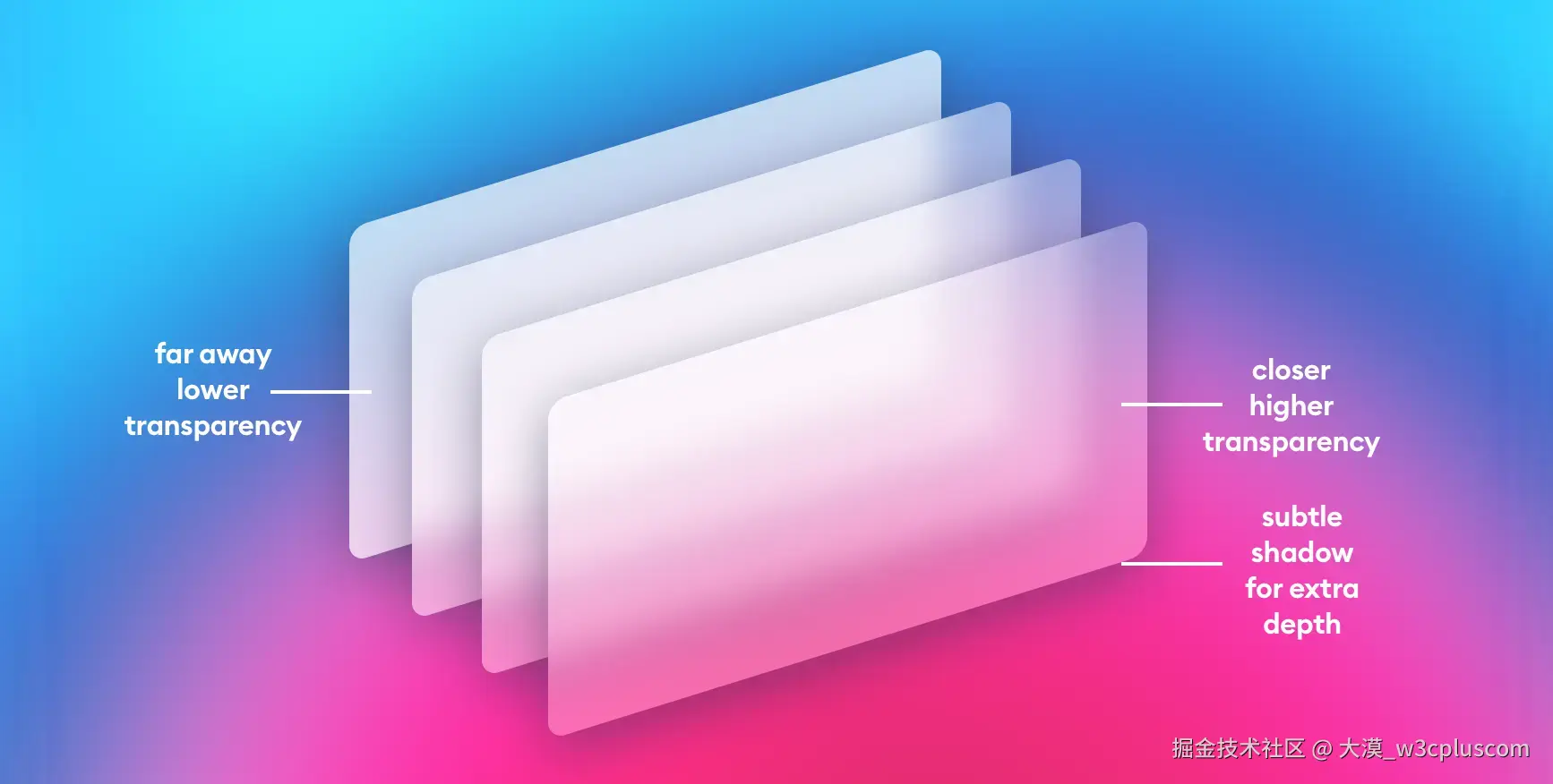 Glassmorphism UI效果本身很简单,但有些地方需要考虑。其一,对象离我们越近,它吸引的光线就越多。在这种情况下,这意味着它将更加透明一些。