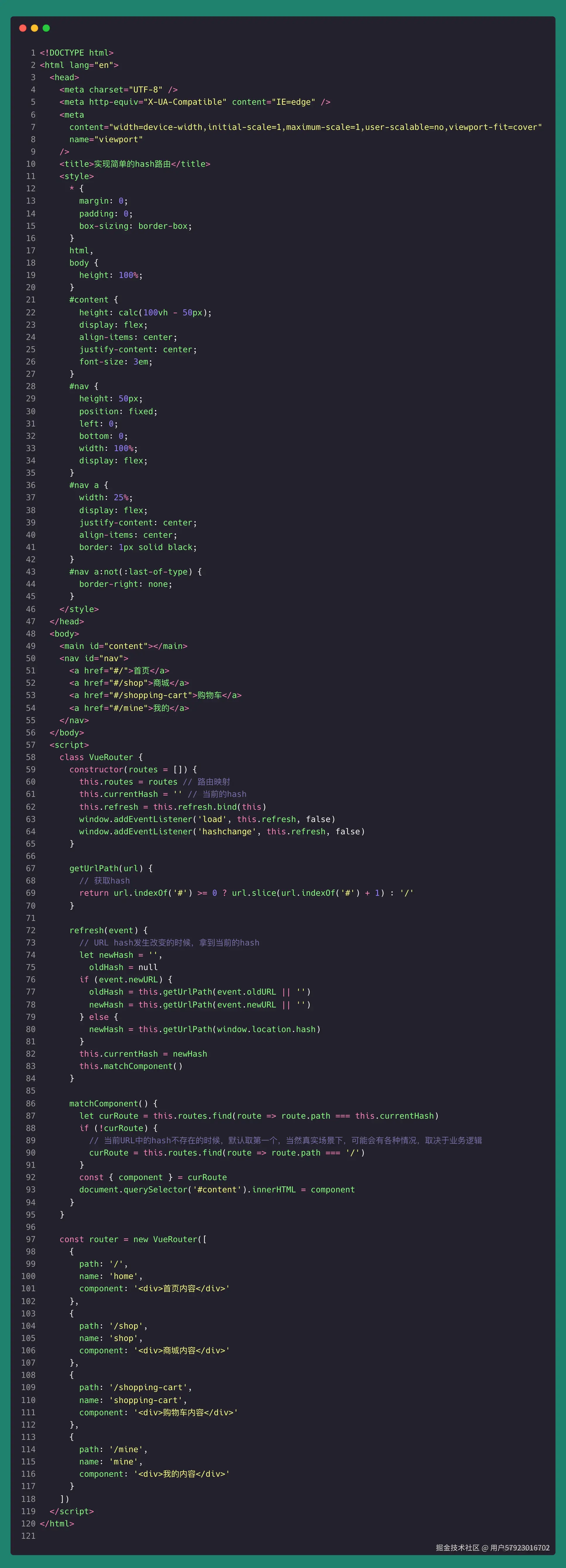 下面是关于hash路由的核心实现,可以看出来,主要就是监听hash的变化,渲染不同的组件代码,代码可以看这里