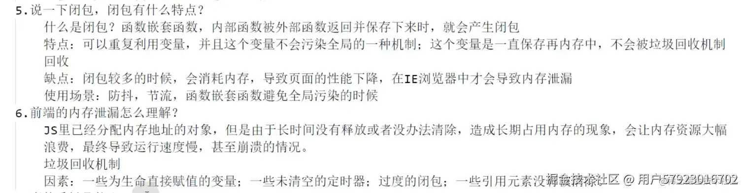 -4.如何避免闭包引起内存泄漏?****** 1,在退出函数之前,将不使用的局部变量全部删除。可以使变量赋值为null;**** 2,避免变量的循环赋值和引用。**** 利用Jquery释放自身指定的所有事件处理程序