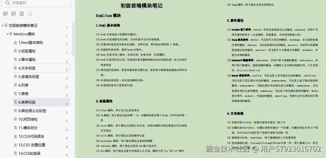 **HTML:**HTML基本结构,标签属性,事件属性,文本标签,多媒体标签,列表 / 表格 / 表单标签,其他语义化标签,网页结构,模块划分