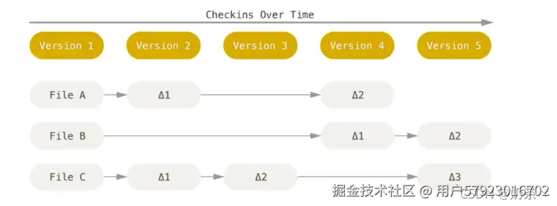 传统的版本控制系统是基于差异的版本控制,它们存储的是一组基本文件和每个文件随时间逐步积累的差异