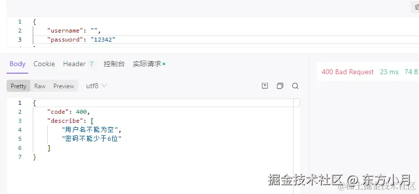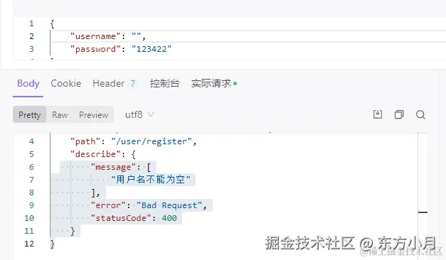 我们发现怎么describe是个对象,还有 statusCode,error 等字段? 这是因为过滤器ValidationPipe内部抛出错误用的是BadRequestException,如
