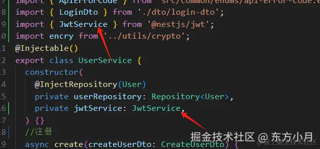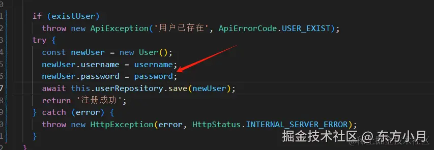 接下来在user.service.ts中的create函数写一下注册的逻辑,其实很简单,拿到前端传来的用户名和密码插入数据库就行了,插入数据库之前首先需要判断用户是否存在,存在的话抛出一个业务异常返回给前端一个自定义的业务状态码ApiErrorCode.USER_EXIST,不存在的话再向数据库添加一条数据,再此之前需要先在common/enums/api-error-code.enum自定义一个异常 code