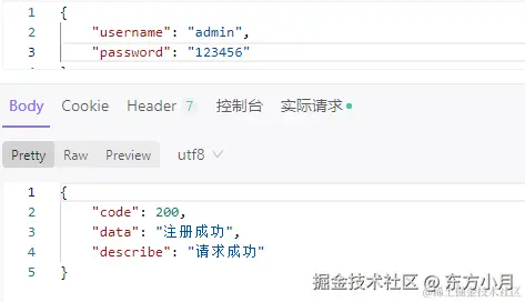 这里的注册接口只接收用户名和密码,至于头像邮箱等可以在个人中心更新,后续后有专门的接口。