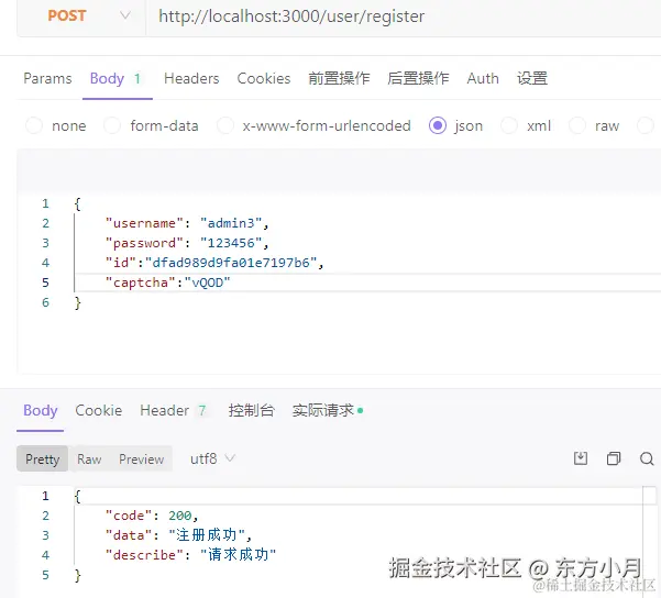 先调用获取验证码接口拿到图片中的 text 和 id,然后放到注册接口调用