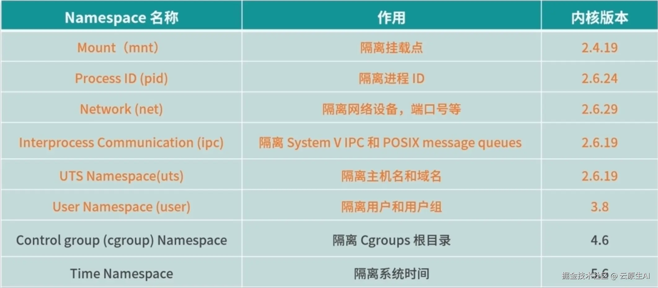 这种隔离机制和 chroot 很类似,chroot 是把某个目录修改为根目录,从而无法访问外部的内容,namespace 正是受到这种思想的影响产生的,所以,第一个namespace类型就是mount namespace,后续又提供了uts namespace、ipc namespace、pid namespace、networknamespace、user namespace等类型隔离机制,如下: