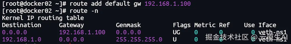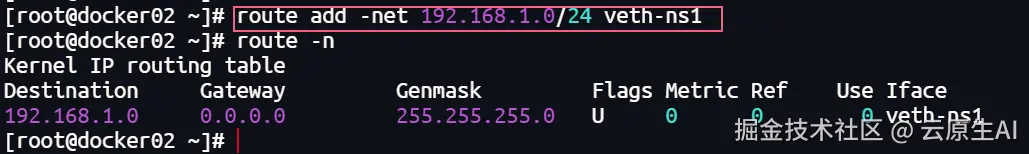 [root@docker02 ~]# ip netns exec docker_ns1 ip address add 192.168.1.1/24 dev veth-ns1