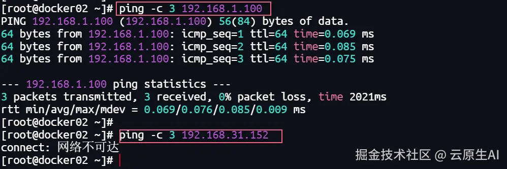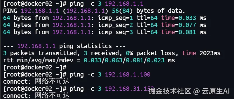 再次测试网络,发现到192.168.1.100(docker_br0网桥设备)网络连通,但是192.168.31.152(宿主机IP)不通: