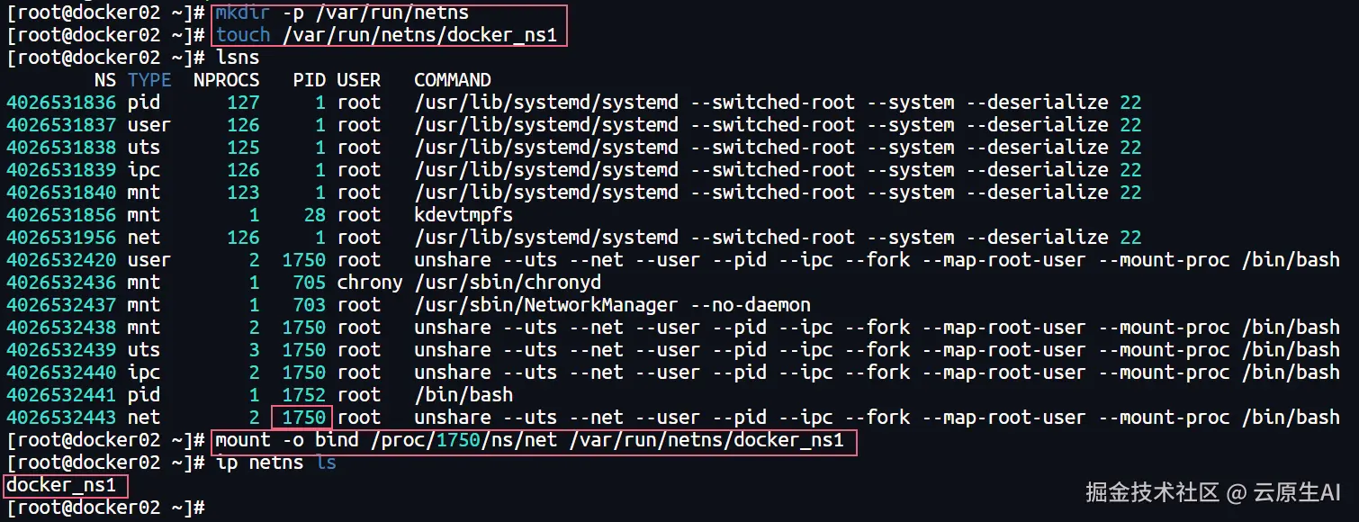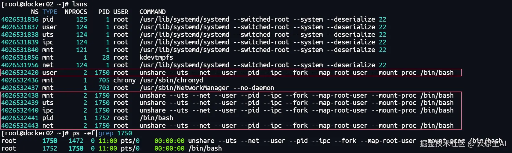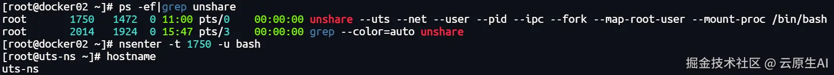 [root@docker02 ~]# unshare --uts --net --user --pid --ipc --fork --map-root-user --mount-proc /bin/bash