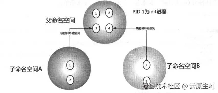 2、通过这种方式,不同的PID namespace会形成一个层级体系,所属的父节点可以看到子节点中的进程,并可以通过信号等方式对子节点中的进程产生影响;反过来,子节点却不能看到父节点PID namespace中的任何内容。