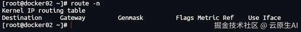 查看下容器里的路由表(见下图),路由表是空的,所以导致对外的网络不通:
