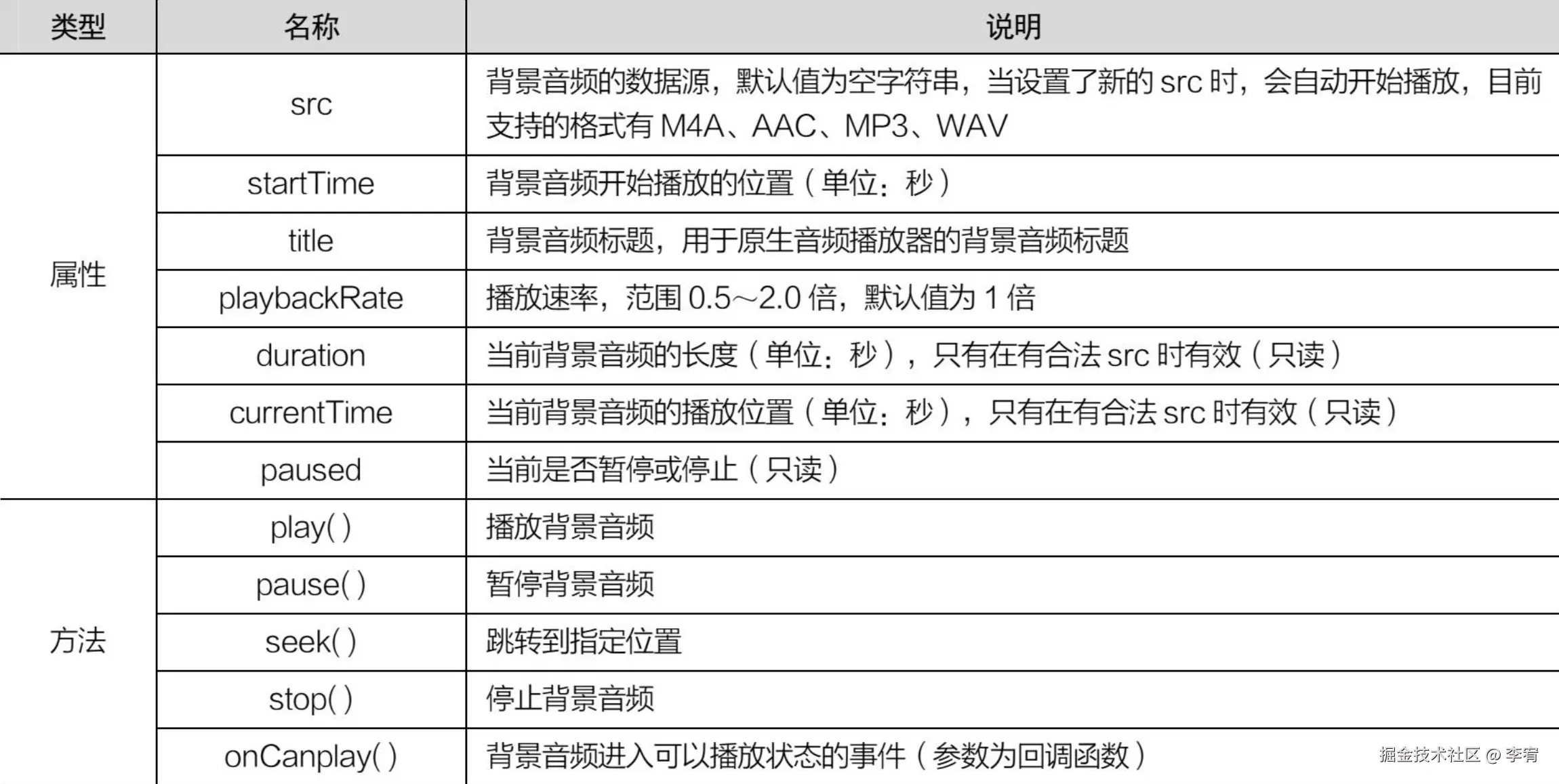 "requiredBackgroundModes": ["audio"]- 背景音频API的使用方法是,先通过wx.getBackgroundAudioManager()方法获取到一个BackgroundAudioManager实例,然后通过该实例的相关属性和方法实现背景音频的播放。