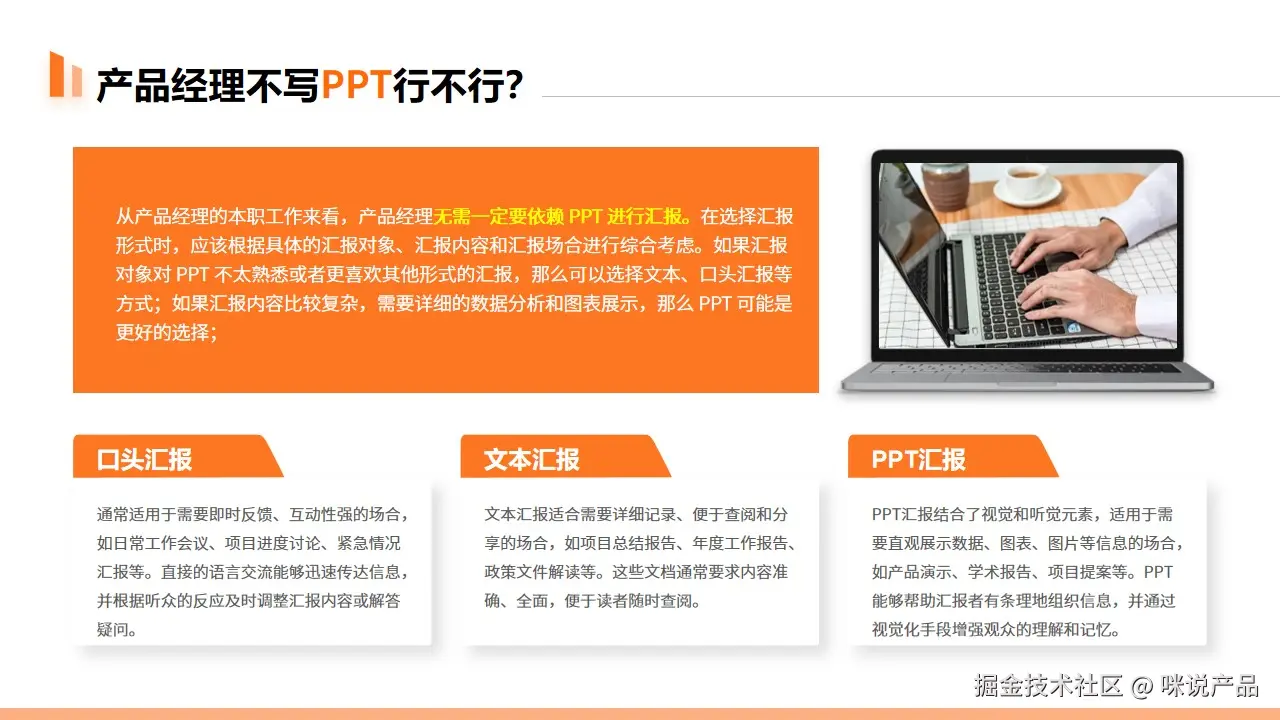 所以,产品经理不一定要写 PPT,但需要掌握多种汇报方式,根据实际情况选择合适的汇报形式,以达到最佳的汇报效果。而不是陷入对 PPT 这个工具的过度依赖或纠结之中。
