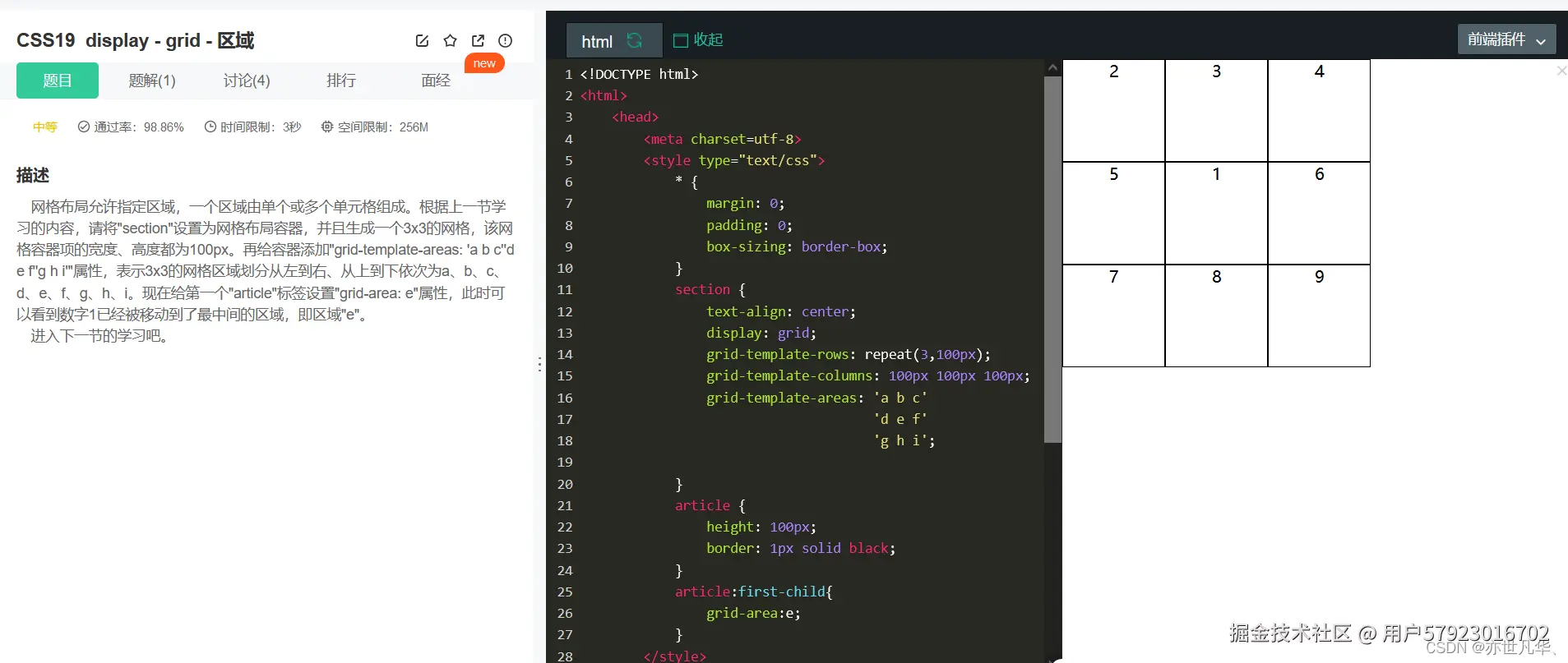 网格布局允许指定区域,一个区域由单个或多个单元格组成。根据上一节学习的内容,请将"section"设置为网格布局容器,并且生成一个3x3的网格,该网格容器项的宽度、高度都为100px。再给容器添加"grid-template-areas: 'a b c''d e f''g h i'"属性,表示3x3的网格区域划分从左到右、从上到下依次为a、b、c、d、e、f、g、h、i。现在给第一个"article"标签设置"grid-area: e"属性,此时可以看到数字1已经被移动到了最中间的区域,即区域"e"。