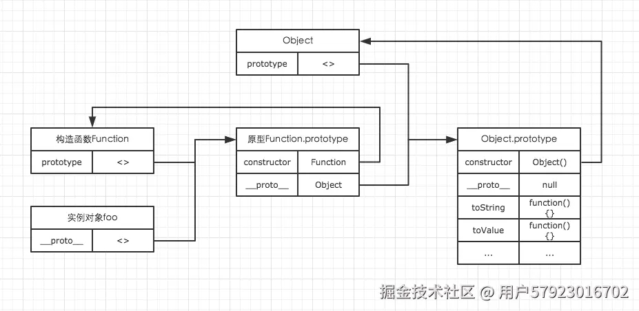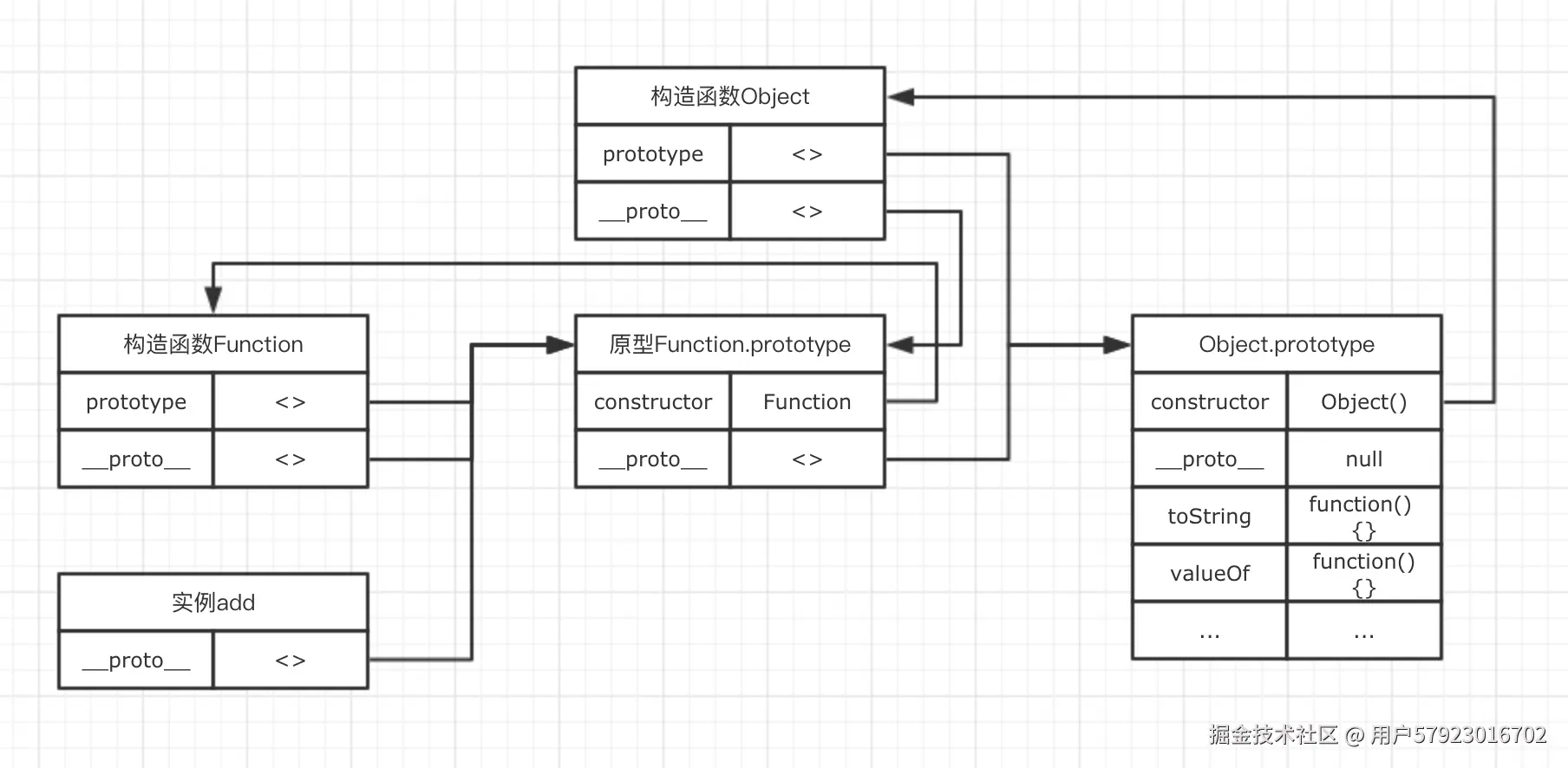 其中add是Function对象的实例。而Function的原型对象同时又是Object的实例。这样就构成了一条原型链。原型链的访问,其实跟作用域链有很大的相似之处,他们都是一次单向的查找过程。因此实例对象能够通过原型链,访问到处于原型链上对象的所有属性与方法。这也是foo最终能够访问到处于Object原型对象上的toString方法的原因。