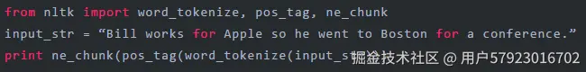 (S (PERSON Bill/NNP) works/VBZfor/INApple/NNP so/INhe/PRP went/VBDto/TO(GPE Boston/NNP)for/INa/DT conference/NN ./.)
