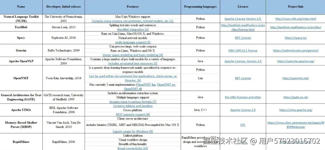 代词和其他引用表达应该与正确的个体联系起来。Coreference resolution 在文本中指的是引用真实世界中的同一个实体。如在句子 “安德鲁说他会买车”中,代词“他”指的是同一个人,即“安德鲁”。常用的 Coreference resolution 工具如下表所示,包括Stanford CoreNLP,spaCy,Open Calais,Apache OpenNLP 等。