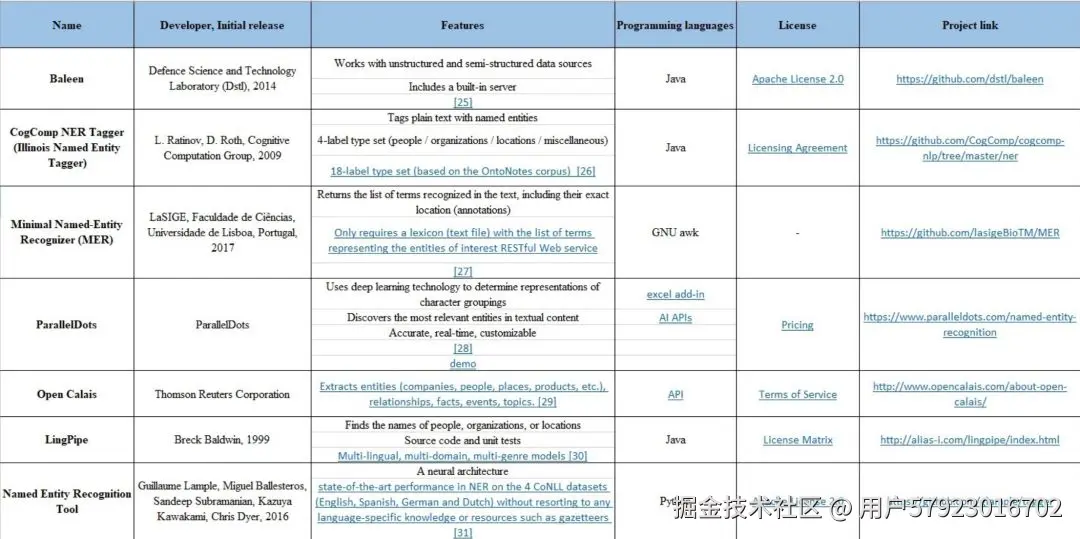 常见的命名实体识别工具如下表所示,包括:NLTK,spaCy,文本工程通用架构(GATE) -- ANNIE,Apache OpenNLP,Stanford CoreNLP,DKPro核心,MITIE,Watson NLP,TextRazor,FreeLing 等。