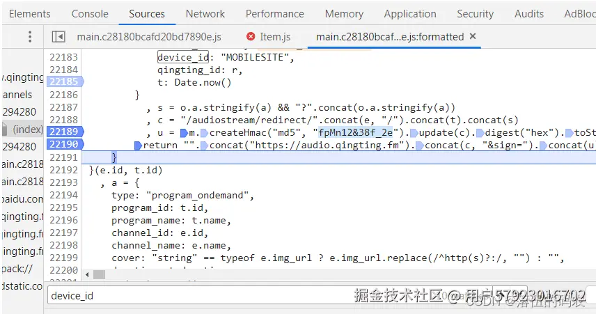 在mian.一大堆.js 找到了生成sign的函数(需要自己分辨一下是一个device_id: "MOBILESITE"的)
