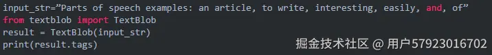 [(‘Parts’, u’NNS’), (‘of’, u’IN’), (‘speech’, u’NN’), (‘examples’, u’NNS’), (‘an’, u’DT’), (‘article’, u’NN’), (‘to’, u’TO’), (‘write’, u’VB’), (‘interesting’, u’VBG’), (‘easily’, u’RB’), (‘and’, u’CC’), (‘of’, u’IN’)]