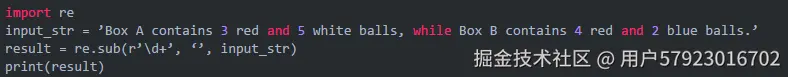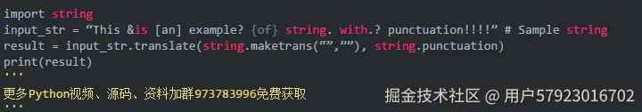 以下示例代码演示如何删除文本中的标点符号,如 [!”#$%&’()*+,-./:;<=>?@[]^_`{|}~] 等符号。