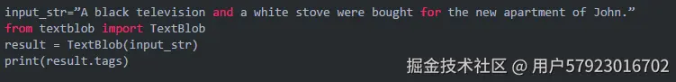 [(‘A’, u’DT’), (‘black’, u’JJ’), (‘television’, u’NN’), (‘and’, u’CC’), (‘a’, u’DT’), (‘white’, u’JJ’), (‘stove’, u’NN’), (‘were’, u’VBD’), (‘bought’, u’VBN’), (‘for’, u’IN’), (‘the’, u’DT’), (‘new’, u’JJ’), (‘apartment’, u’NN’), (‘of’, u’IN’), (‘John’, u’NNP’)]