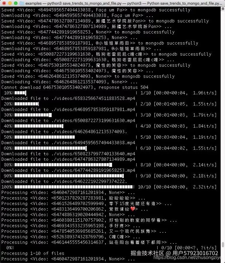 在这里我们可以看到视频被成功存储到了 MongoDB 数据库,并且执行了下载,将视频存储到了本地(音频的的存储没有显示)。