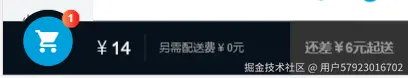 购物车有多种状态:(1)没有购买商品时,购物车全部灰色(2)当购买商品时,购物车右上角回有商品件数,并且会按照商品计算出价格,(3)当达到配送金额会显示“去结算”,不然就显示“还差XX元起送”。