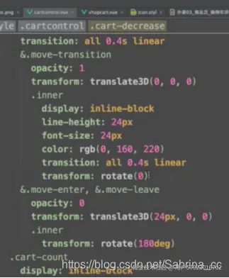 对于(1):首先,使用v-show控制组件只有商品件数大于零显示。每个按钮维护一个food,并且对于按钮点击绑定add()和decease()事件用于记录商品的数量count。同时在父组件goods中维护计算属性selectFood(),用于计算商品数量,父组件将selectfood作为props传入shop-cart,从而实现两个兄弟组件之间的数据交互。对于过渡动画,使用组件通过v-show驱动。外层偏移内层rotate滚动,从而实现一边偏移一边滚动的渐出效果显示。