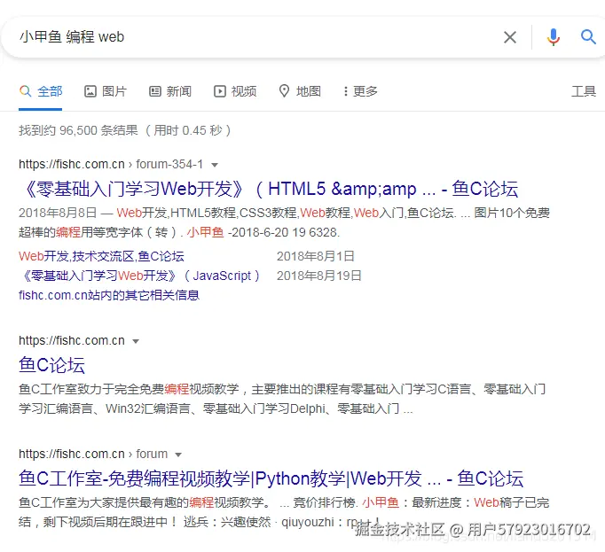这时候返回的前两个结果都是包含小甲鱼或编程的帖子: