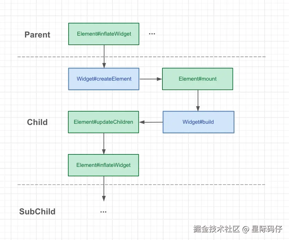 如上所示,我们又看到了 inflateWidget 方法,说明又开始了下一级的递归构建,接下来将通过调用 newWidget 的 createElement 方法创建子 Element,就这样逐级进行,最终完成了 Widget 树对 Element 树的转换。