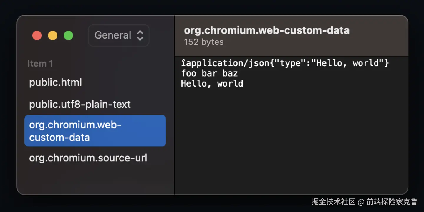 我们已经知道,我们可以跨浏览器选项卡向剪贴板写入自定义数据类型,也可以从剪贴板读取自定义数据类型,但不能跨应用程序写入。但是,当我们将自定义数据类型写入网络剪贴板时,浏览器究竟会向本机操作系统剪贴板写入什么?