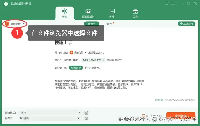 第一步: 启动数据 蛙视频转换器后,进入软件的主界面。点击 【添加文件】 ,在文件浏览器中选择并导入目标音频文件。