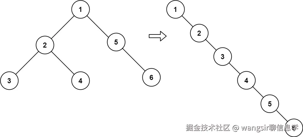 TreeNode,其中right子指针指向链表中下一个结点,而左子指针始终为null。 - 展开后的单链表应该与二叉树 先序遍历 顺序相同。