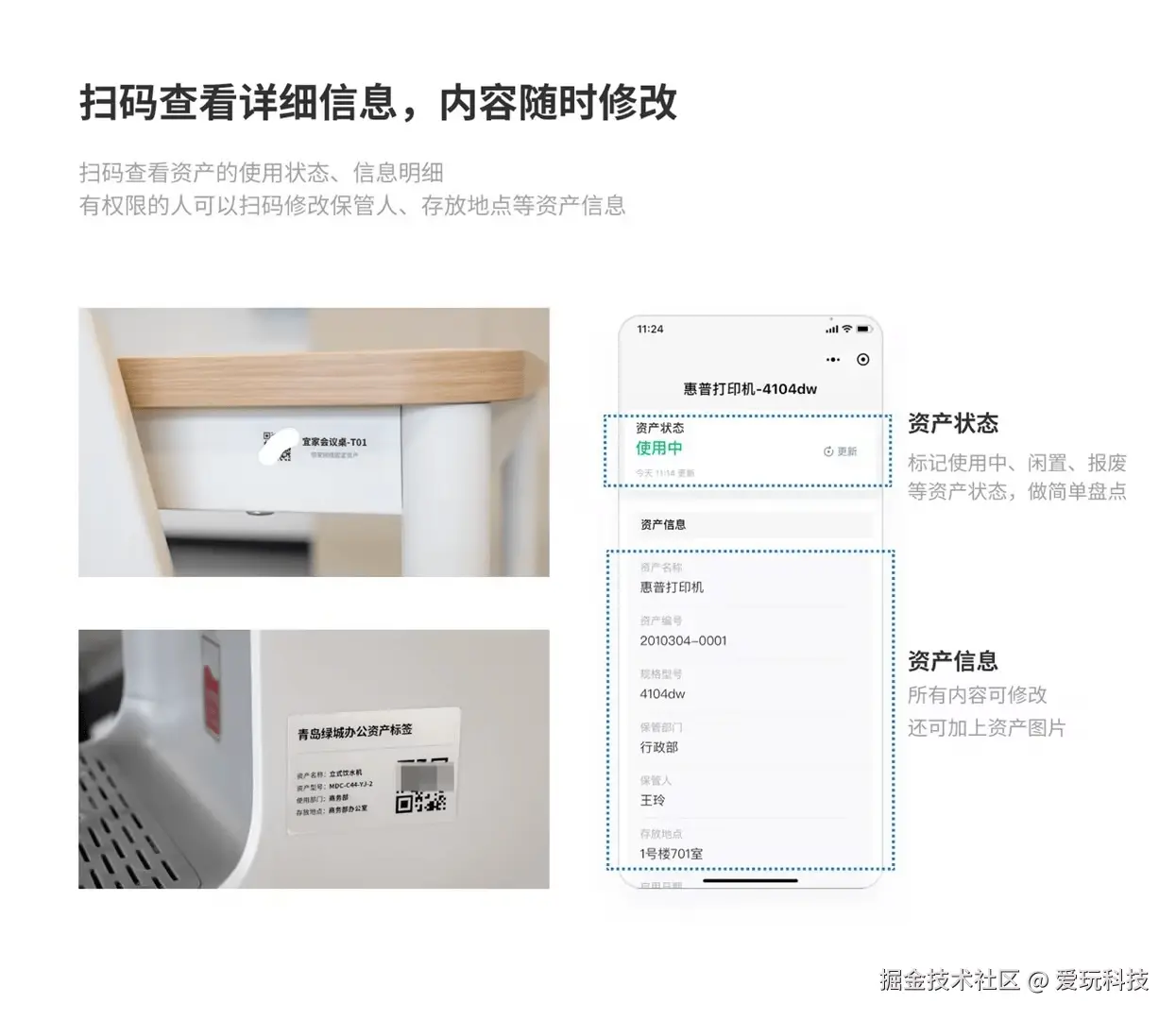 3、 扫码使用:需要核对资产使用情况时,使用手机扫一扫功能扫描二维码,查看并更新资产信息。还可以扫码进行借还登记、领用登记、故障报修等操作。