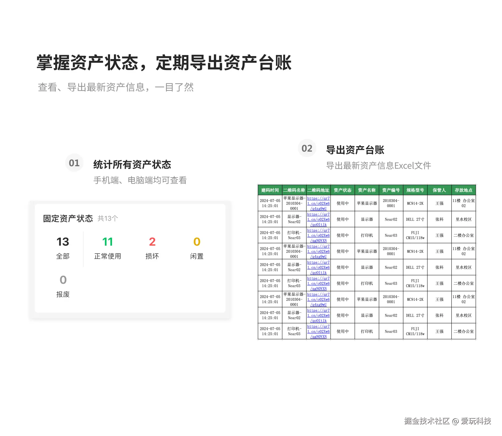 4、 管理数据:管理人员可通过电脑端或小程序工作台,实时查看资产状态和历史操作记录,并将数据导出形成电子台账。