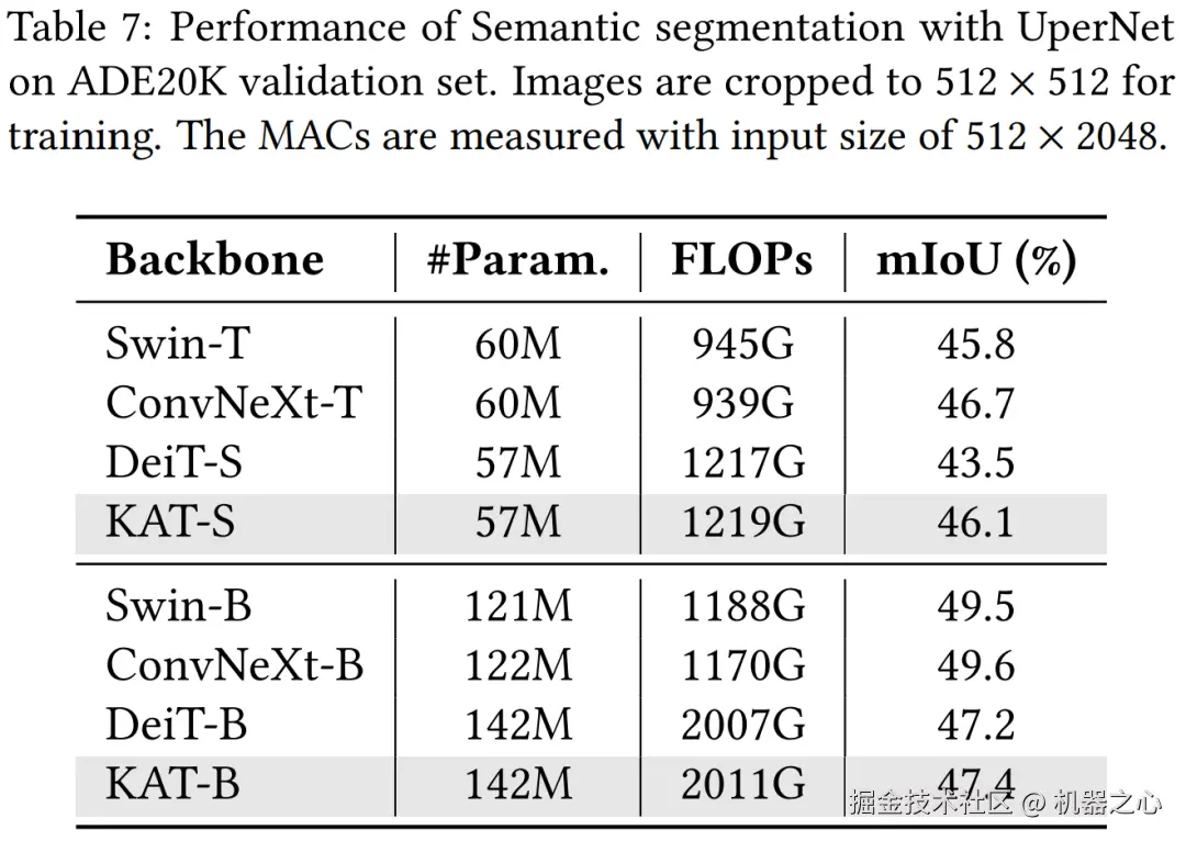 表 7 总结了分割结果。总体而言,KAT 比基于 ViT 的普通架构表现出了竞争优势,比 DeiT-S 提高了 2.4%,比 DeiT-B 提高了 0.2%。这种性能提升伴随着计算成本的轻微增加,反映在更高的 FLOP 上。与检测结果类似,KAT 在较小的模型中显示出更显著的收益。然而,与具有分层架构的模型(如 ConvNeXt)相比,它仍然有所不足,这些模型受益于更高效的架构设计。