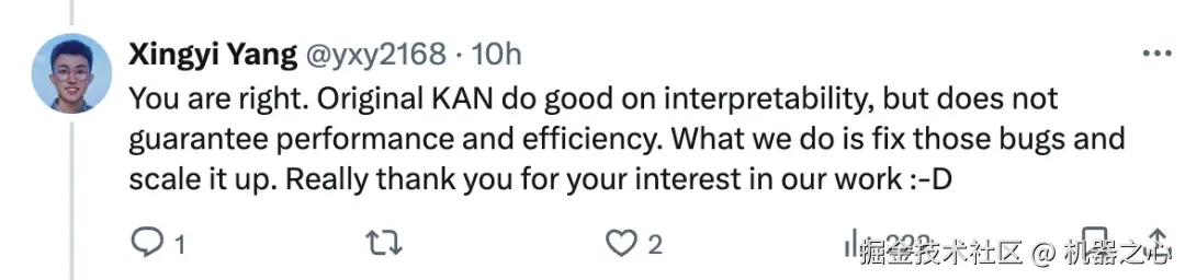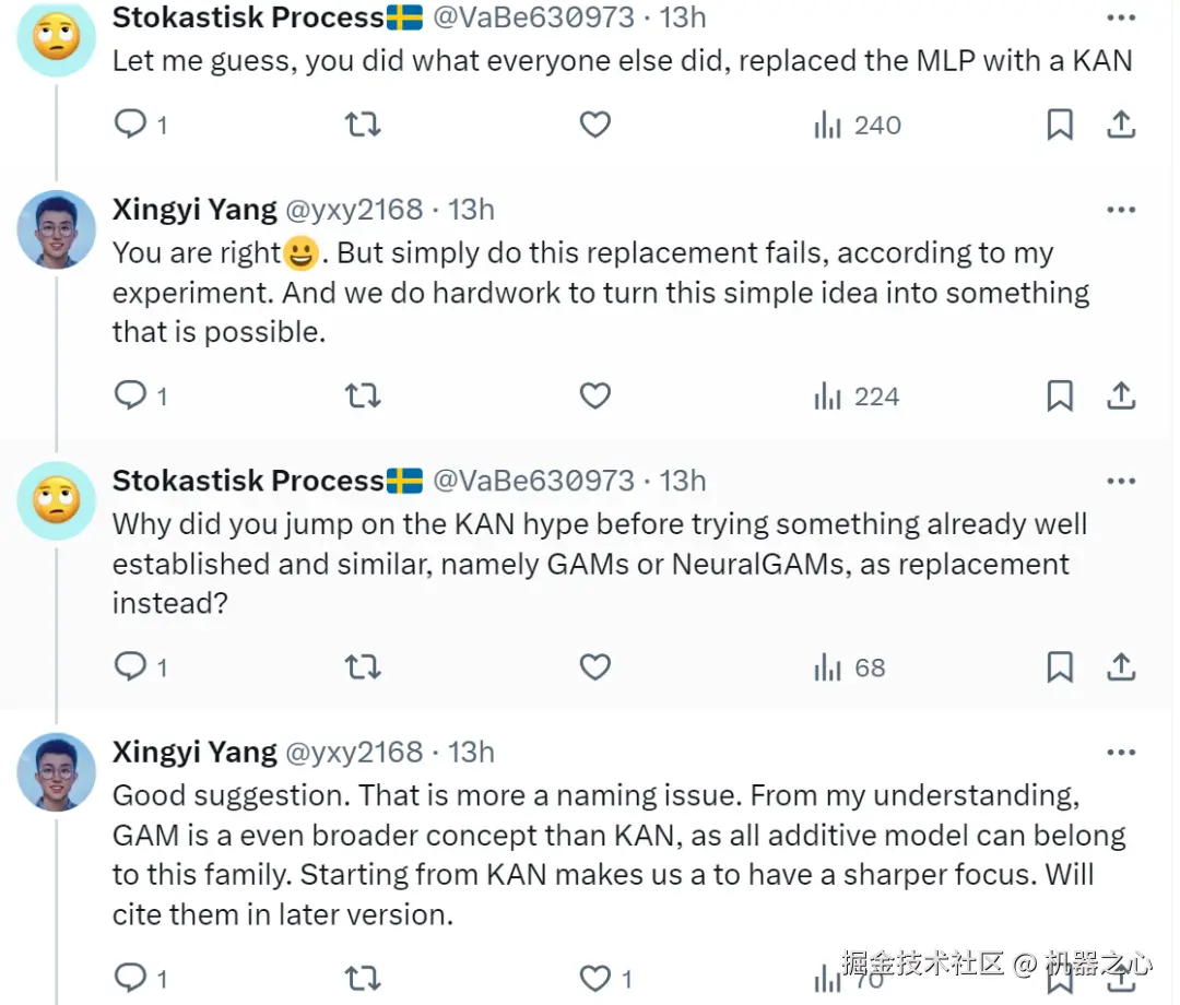 还有网友表示,这篇论文和其他人的想法一样,就是用 KAN 取代了 MLP,并质疑为什么作者在尝试一些已经很成熟和类似的东西,难道是在炒作 KAN?对此, 论文作者 Xingyi Yang 解释道,事实确实如此,但不是炒作,根据实验,简单地进行这种替换是行不通的,他们在努力将这个简单的想法变成可能的事情。