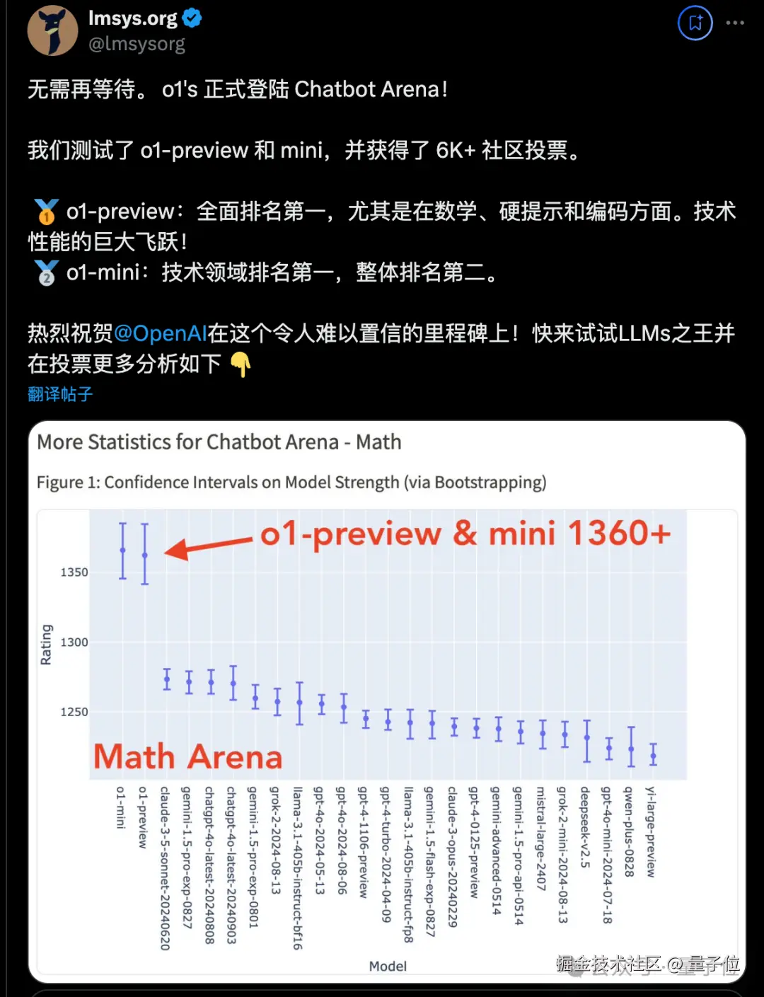 话说 o1 系列正式登 Lmsys 大模型竞技场,第一次分数结算,在数学任务上断崖式领先,唯一的缺点就是回答有点慢了。