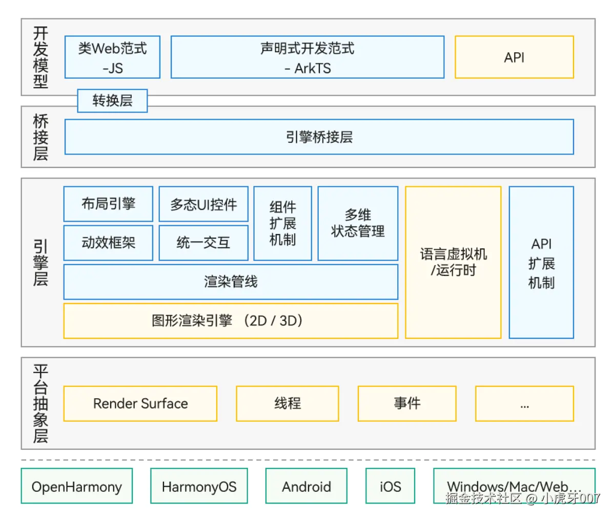 框架后端采用C++ 开发语言实现,提升了框架的运行性能,使用方舟编译器运行时作 为 JS引擎,具有更优的 JS 执行性能,同时还提供了一套完整的包含UI 组件、布局机制、 动画能力的渲染框架,通过渲染引擎对UI元素进行绘制。