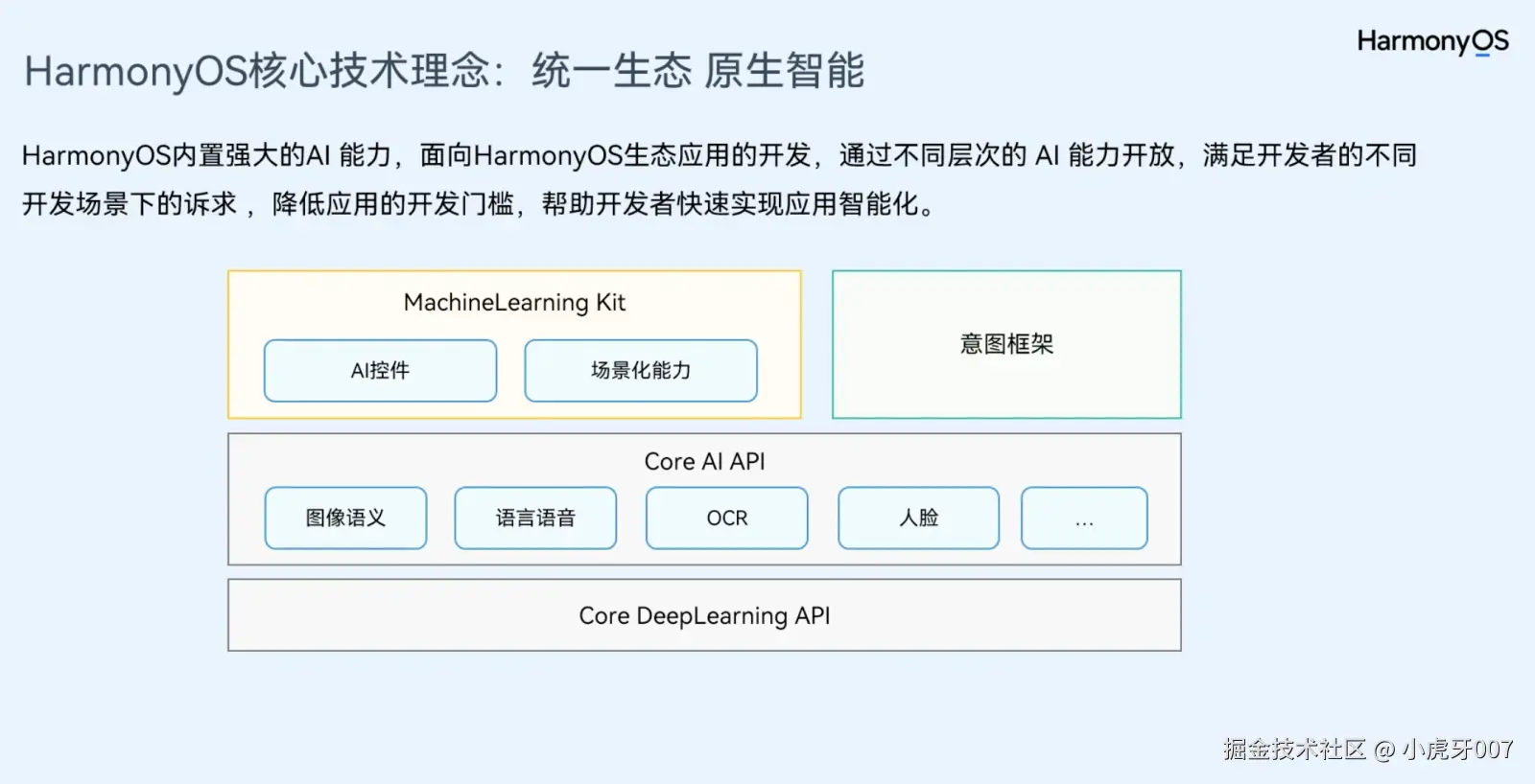 鸿蒙系统内置强大的 AI 能力,面向鸿蒙生态应用的开发,通过不同层次的 AI 能力开放,满足开发者的不同开发场景下的诉求,降低应用的开发门槛,帮助开发者快速实现应用智能化