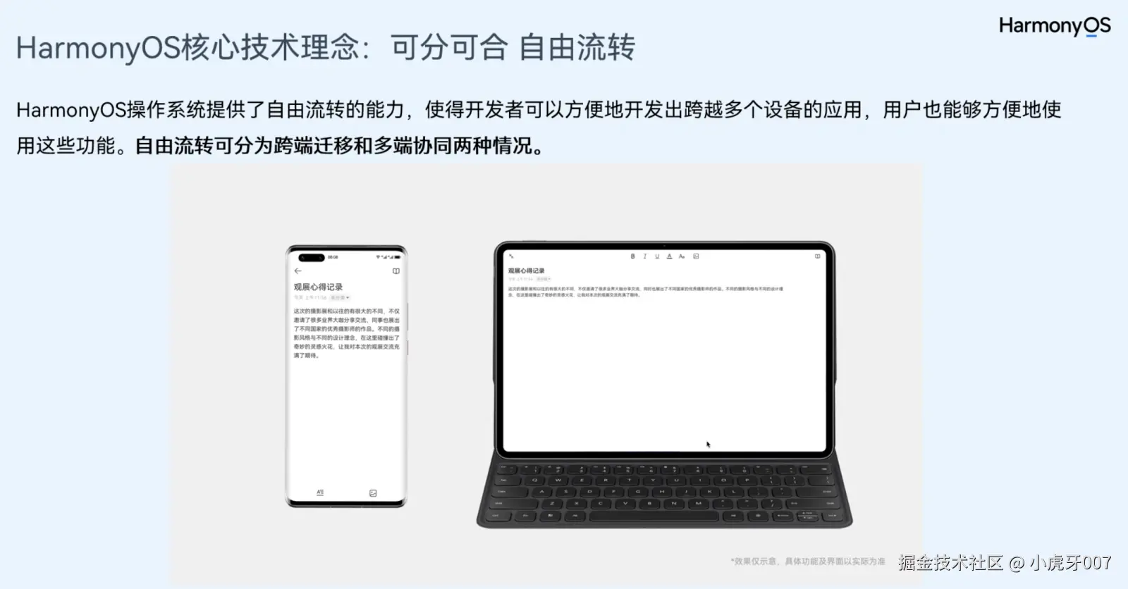 自由流转可分为跨端迁移和多端协同两种情况。他们分别是时间上的串行交互和时间上的并行交互。自由流转不仅带给用户全新的交互体验,也为开发者搭建了一座从单设备时代