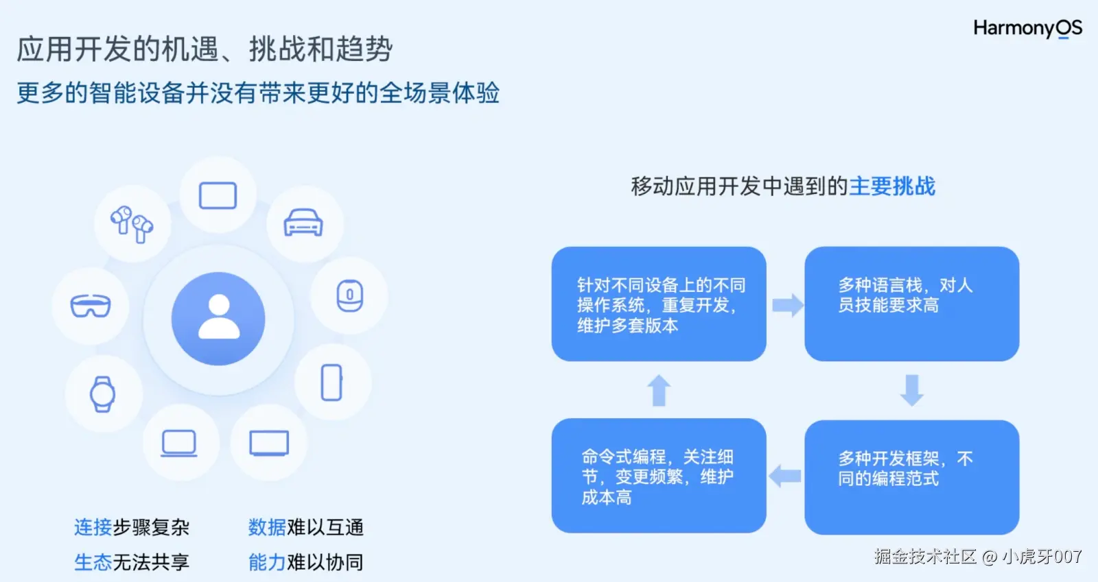 新的场景同时也带来了新的挑战。开发者不仅需要支持更加多样化的设备,还需要支持跨设备的协作。不同设备类型意味着不同的传感器能力、硬件能力、屏幕尺寸、操作系统和开发语言,还意味着差异化的交互方式。同时跨设备协作也让开发者面临分布式开发带来的各种复杂性,例如跨设备的网络通信、数据同步等。若采取传统开发模式,适配和管理工作量将非常巨大。当前移动应用开发中遇到的主要挑战包括: