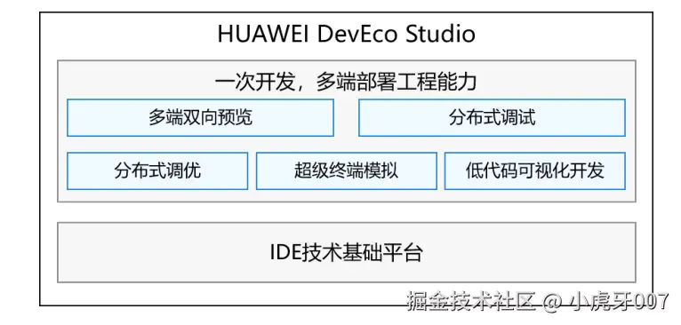 HUAWEI DevEco Studio 是面向全场景多设备提供的一站式开发平台,支持多端双向预览、分布式调优、分布式调试、多设备模拟、低代码可视化开发等能力,帮助开发者降低成本、提升效率、提高质量。HUAWEI DevEco Studio 提供的核心能力如下图所示