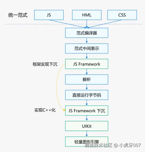 类 Web 范式实现层面可以进一步部署到轻量化的设备上。通过轻量化设计的思路,将 JS Framework下沉到C++ 层,以减小JS的内存占用,使用C++ 进行更为严格的内存分配 管理,并采用更为轻量的JS 引 擎 ,UI 部分采用轻量的UIKit并结合轻量图形引擎最终实现 百K 级别设备的支持,从而在轻量化设备上可执行的应用,也可以在硬件规格更高的设备上 执行,而无需重新开发。这也就是采用类 Web 开发范式的优势所在,采用统一的开发范式, 开发者无需关心具体运行时的前端框架、JS 引擎与后端UI 组件,系统会根据运行平台不同, 采用最佳的模块,保障应用在不同平台都可具有出色的运行性能。具体的实现原理如下图所 示: