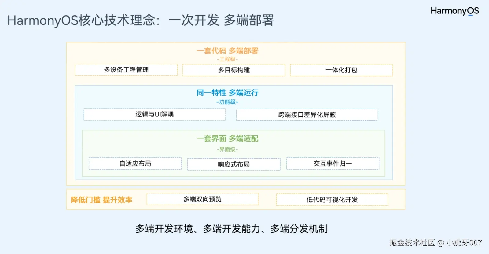 一次开发,多端部署”指的是一个工程,一次开发上架,多端按需部署。目的是为了支撑开发者高效地开发多种终端设备上的应用。为了实现这一目的,鸿蒙系统提供了几个核心能力,包括多端开发环境,多端开发能力以及多端分发机制